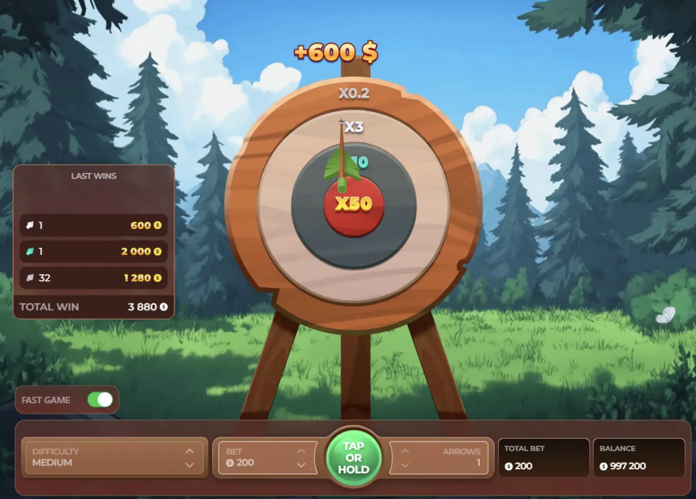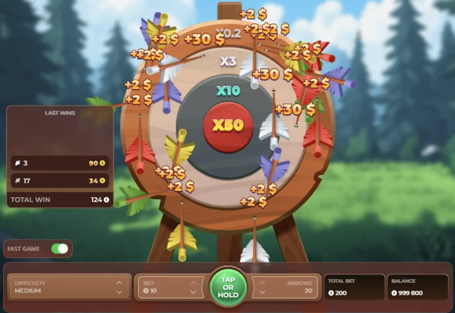 - Tap or hold the ‘play’ and watch as your arrow(s) strike the target. Your payout depends on the difficulty level as well as where your arrow strikes the target.